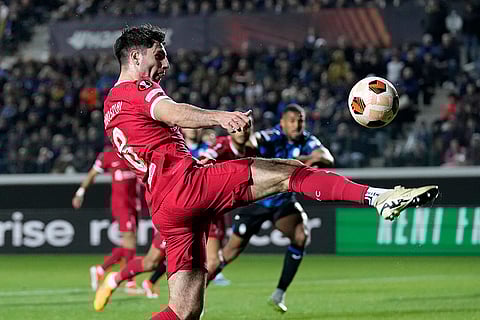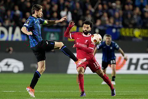 Atalanta's Marten de Roon, left, kicks the ball away from Liverpool's Mohamed Salah during the Europa League quarterfinal, second leg, soccer match between Atalanta and Liverpool at the Stadio di Bergamo, in Bergamo, Italy.