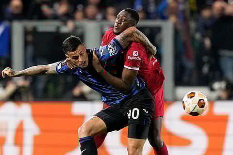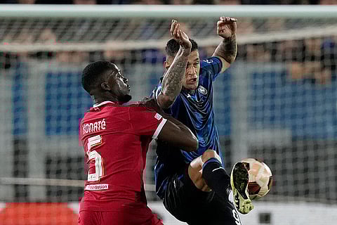 Liverpool's Ibrahima Konate, left, fights for the ball with Atalanta's Gianluca Scamacca during the Europa League quarterfinal, second leg, soccer match between Atalanta and Liverpool at the Stadio di Bergamo, in Bergamo, Italy.