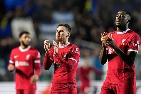 Liverpool's Joe Gomez, Andrew Robertson and Ibrahima Konate, from left, applaud their supporters at the end of the Europa League quarterfinal, second leg, soccer match between Atalanta and Liverpool at the Stadio di Bergamo, in Bergamo, Italy. Atalanta won 1-0 and advances to the semifinals.