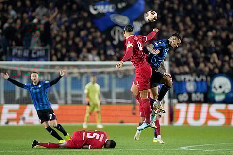 Liverpool's Virgil van Dijk jumps for the ball with Atalanta's Gianluca Scamacca, right, during the Europa League quarterfinal, second leg, soccer match between Atalanta and Liverpool at the Stadio di Bergamo, in Bergamo, Italy.