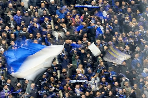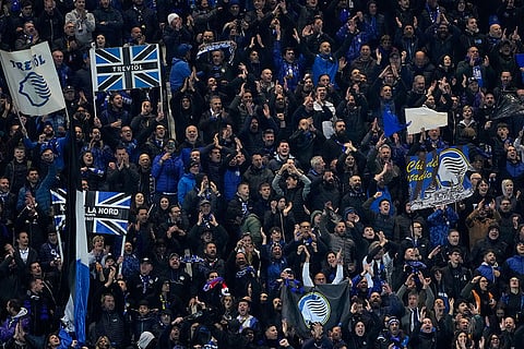 Atalanta supporters cheer on their team during the Europa League quarterfinal, second leg, soccer match between Atalanta and Liverpool at the Stadio di Bergamo, in Bergamo, Italy.