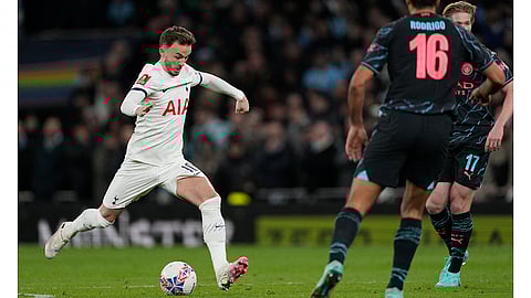 Tottenham's James Maddison passes the ball during the English FA Cup fourth round soccer match between Tottenham Hotspur and Manchester City in London.