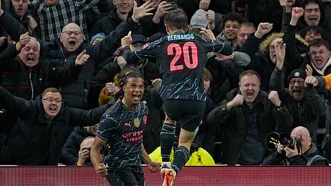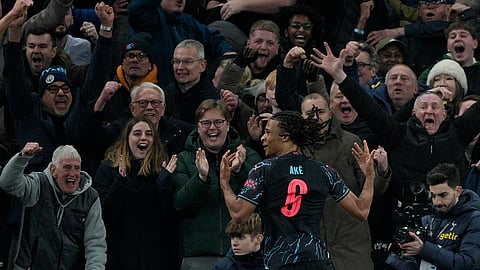 Manchester City's Nathan Ake celebrates after scoring the opening goal during the English FA Cup fourth round soccer match between Tottenham Hotspur and Manchester City in London.