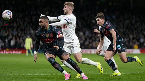 Tottenham's Timo Werner, center, battles for the ball with Manchester City's Kyle Walker, left, and Manchester City's Julian Alvarez during the English FA Cup fourth round soccer match between Tottenham Hotspur and Manchester City in London.