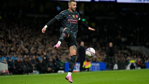 Manchester City's Kyle Walker controls the ball during the English FA Cup fourth round soccer match between Tottenham Hotspur and Manchester City in London.