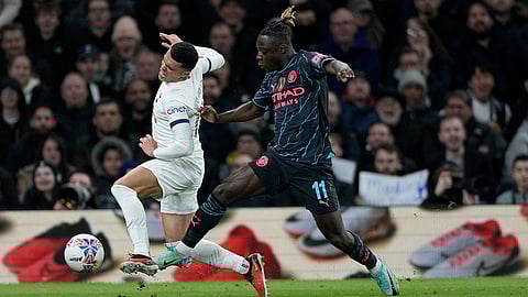 Manchester City's Jeremy Doku, right, and Tottenham's Pedro Porro battle for the ball during the English FA Cup fourth round soccer match between Tottenham Hotspur and Manchester City in London.