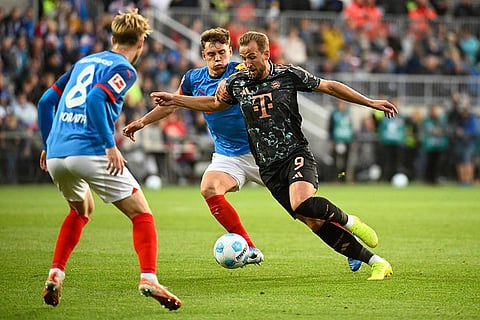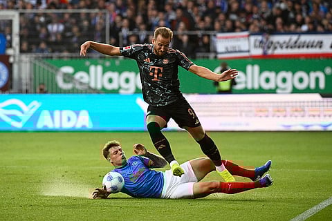 Bayern Munich's Harry Kane, top, tries to get the ball past Kiel's Finn Porath during a Bundesliga soccer match in Kiel, Germany.