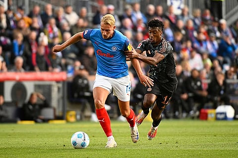 Kiel's Timo Becker, left, and Bayern's Kingsley Coman fight for the ball during the German Bundesliga soccer match between Holstein Kiel and Bayern Munich, at the Holsten stadium in Kiel, Germany.