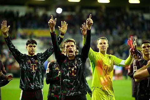 Bayern's Thomas Müller, center, celebrates his side's 6-1 win after the German Bundesliga soccer match between Holstein Kiel and Bayern Munich, at the Holsten stadium in Kiel, Germany.