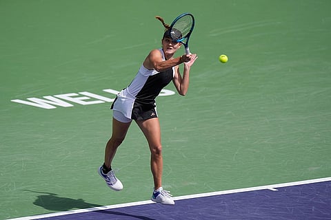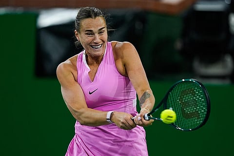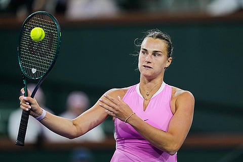 Aryna Sabalenka, of Belarus, returns a shot against Peyton Stearns, of the United States, at the BNP Paribas Open tennis tournament in Indian Wells, Calif.