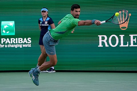 Novak Djokovic, of Serbia, returns to Aleksandar Vukic, of Australia, at the BNP Paribas Open tennis tournament in Indian Wells, Calif.