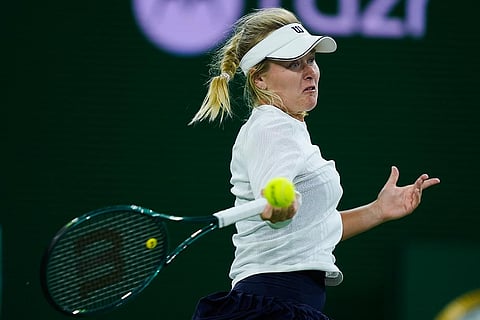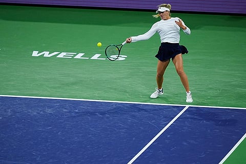 Peyton Stearns, of the United States, returns a shot against Aryna Sabalenka, of Belarus, at the BNP Paribas Open tennis tournament in Indian Wells, Calif.