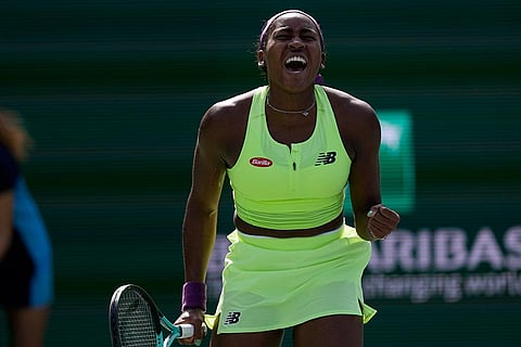 Coco Gauff, of the United States, celebrates after defeating Clara Burel, of France, at the BNP Paribas Open tennis tournament in Indian Wells, Calif.
