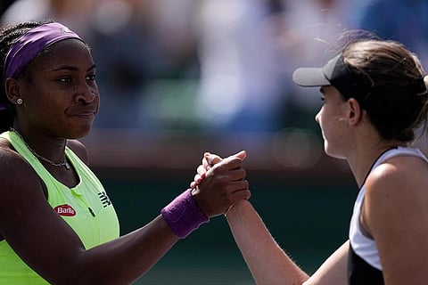 Coco Gauff, of the United States, left, shakes hands with Clara Burel, of France, after defeating her at the BNP Paribas Open tennis tournament in Indian Wells, Calif.