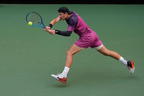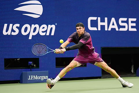 Jack Draper, of Great Britain, returns a shot to Jannik Sinner, of Italy, during the men's singles semifinal of the U.S. Open tennis championships in New York.
