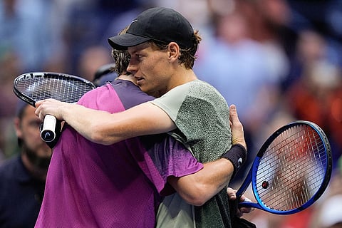 Jannik Sinner, of Italy, right greets Jack Draper, of Great Britain, after winning their semifinal match of the U.S. Open tennis championships in New York.