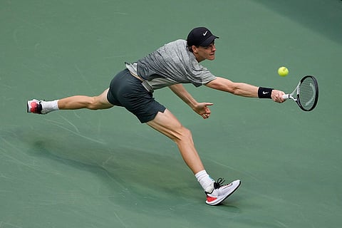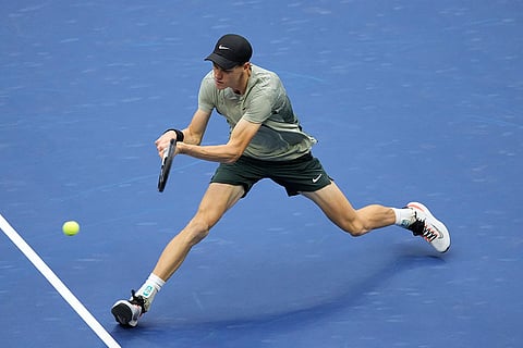 Jannik Sinner, of Italy, returns a shot to Jack Draper, of Great Britain, during the men's singles semifinals of the U.S. Open tennis championships in New York.