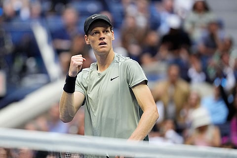 Jannik Sinner, of Italy, reacts after defeating Jack Draper, of Great Britain, during the men's singles semifinals of the U.S. Open tennis championships in New York.