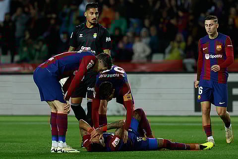 Barcelona's Sergi Roberto, second left, and Barcelona's Robert Lewandowski, left, check on their teammate Raphinha after he was fouled by Las Palmas' goalkeeper Alvaro Valles, top left, during a Spanish La Liga soccer match between Barcelona and Las Palmas at the Olimpic Lluis Companys stadium in Barcelona, Spain.