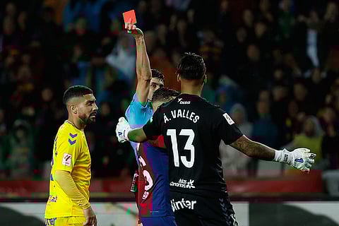 Referee Mateo Busquets Ferrer, background, shows a red card to Las Palmas' goalkeeper Alvaro Valles, right, during a Spanish La Liga soccer match between Barcelona and Las Palmas at the Olimpic Lluis Companys stadium in Barcelona, Spain.