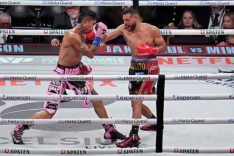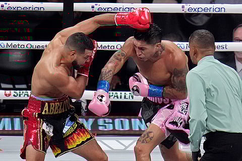 Mario Barrios hits Abel Ramos during a WBC welterweight title bout in Arlington, Texas.