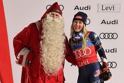 The winner United States' Mikaela Shiffrin celebrates on podium with Santa, after an alpine ski, women's World Cup slalom, in Levi, Finland.
