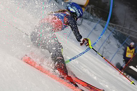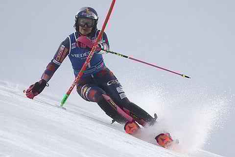 United States' Mikaela Shiffrin speeds down the course during an alpine ski, women's World Cup slalom, in Levi, Finland.