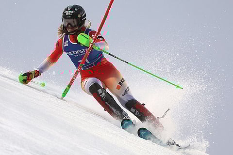 Switzerland's Camille Rast speeds down the course during an alpine ski, women's World Cup slalom, in Levi, Finland.