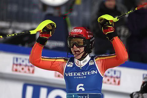 Germany's Lena Duerr reacts after completing the second run of an alpine ski, women's World Cup slalom, in Levi, Finland.