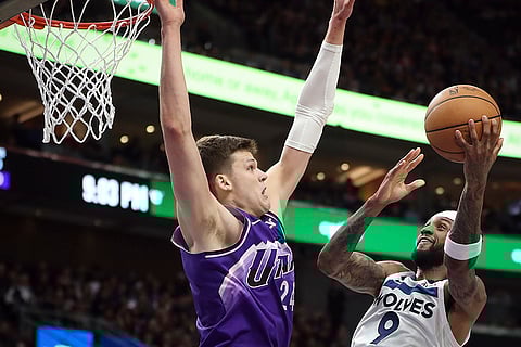 Minnesota Timberwolves guard Nickeil Alexander-Walker (9) shoots through the arms of Utah Jazz center Walker Kessler during the second half of an NBA basketball game in Salt Lake City.