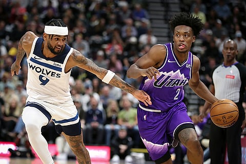 Utah Jazz guard Collin Sexton (2) dribbles around Minnesota Timberwolves guard Nickeil Alexander-Walker (9) during the first half of an NBA basketball game in Salt Lake City.
