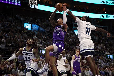 Utah Jazz guard Keyonte George (3) shoots past the outstretched arm of Minnesota Timberwolves center Naz Reid (11) while guard Monte Morris (23) watches during the first half of an NBA basketball game in Salt Lake City.