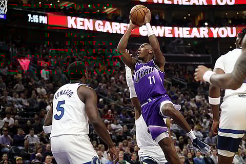 Utah Jazz guard Kris Dunn (11) drives to shoot while Minnesota Timberwolves guard Anthony Edwards (5) defends during the first half of an NBA basketball game in Salt Lake City.