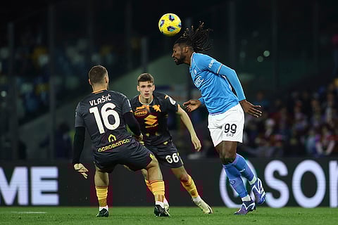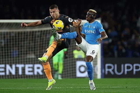 Napoli's Victor Osimhe, left, and Torino's Alessandro Buongiorno fight for the ball during an Italian Serie A soccer match between Napoli and Torino at the Diego Armando Maradona stadium, in Naples, Italy.
