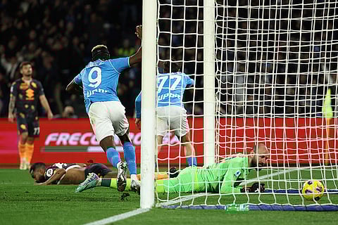 Napoli's Victor Osimhen reacts during an Italian Serie A soccer match between Napoli and Torino at the Diego Armando Maradona stadium, in Naples, Italy.