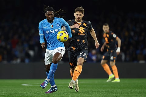 Napoli's Andre-Frank Zambo Anguissa, right, controls the ball during an Italian Serie A soccer match between Napoli and Torino at the Diego Armando Maradona stadium, in Naples, Italy.