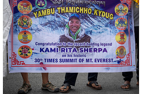 Friends and family members celebrate as renowned Sherpa mountain guide Kami Rita returning from Mount Everest after his record 30th successful ascent, arrives at the airport in Kathmandu, Nepal.