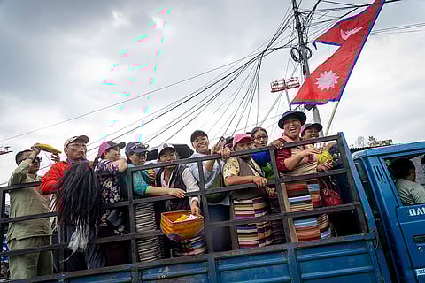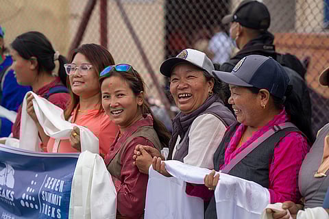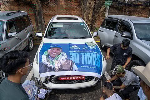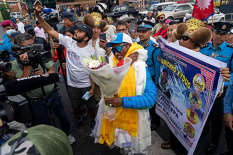 Friends and family members celebrate as renowned Sherpa mountain guide Kami Rita, returning from Mount Everest after his record 30th successful ascent, arrives at the airport in Kathmandu, Nepal.