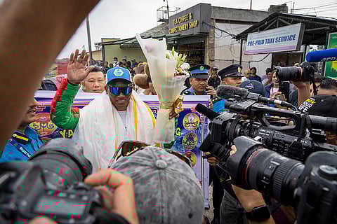 Renowned Sherpa mountain guide Kami Rita returning from Mount Everest after his record 30th successful ascent, waves to media after he arrives at the airport in Kathmandu, Nepal.