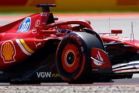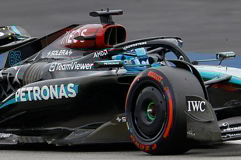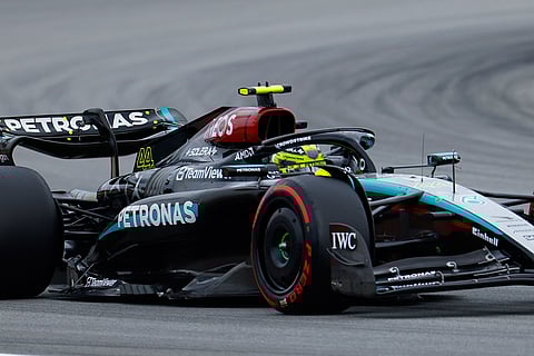 McLaren driver Lando Norris of Britain, center, celebrates after winning the pole position, next to Red Bull driver Max Verstappen of the Netherlands, left, and Mercedes driver Lewis Hamilton of Britain, right, ahead of the Formula 1 Spanish Grand Prix at the Barcelona Catalunya racetrack in Montmelo, near Barcelona, Spain.