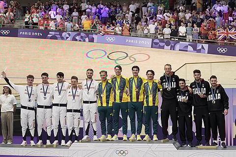 From left, silver medallists team Britain, gold medallists team Australia and bronze medallists team Italy attend the podium ceremony for the men's team pursuit event, at the Summer Olympics in Paris, France.