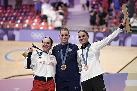 Jennifer Valente of the United States, centre, winner of the gold medal of the women's omnium event, pose with silver medallist Daria Pikulik of Poland, left, and bronze medallist Ally Wollaston of New Zealand, at the Summer Olympics in Paris, France.