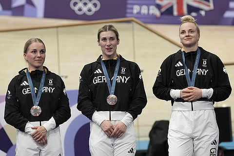 Germany's Lea Friedrich, left, Pauline Grabosch, center, and Emma Hinze pose on podium after winning the bronze medal of the women's team sprint event, at the 2024 Summer Olympics in Paris, France.