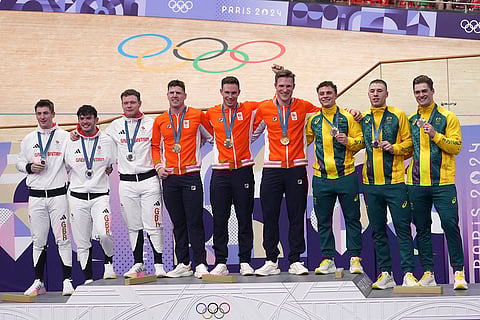 From left, silver medal's winners Britain's Jack Carlin, Hamish Turnbull and Ed Lowe, gold medal's winners Netherlands' Roy van den Berg, Harrie Lavreysen and Jeffrey Hoogland, bronze medal's winners Australia's Matthew Richardson, Leigh Hoffman and Matthew Glaetzer pose during the podium ceremony for the men's team sprint event, at the Summer Olympics in Paris, France.