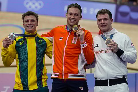 Harrie Lavreysen of Netherlands, centre, shows the gold medal of the men's sprint event, flanked by silver medallist Matthew Richardson of Australia, left, and bronze medallist Jack Carlin of Britain, at the Summer Olympics in Paris, France.