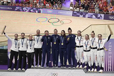 From left, silver medal's winner team New Zealand, gold medal winner team USA and bronze medal's winner team Britain, pose during the podium ceremony for the women's team pursuit event, at the Summer Olympics in Paris, France.
