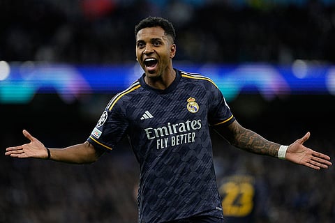 Real Madrid's Rodrygo celebrates after scoring his side's opening goal during the Champions League quarterfinal second leg soccer match between Manchester City and Real Madrid at the Etihad Stadium in Manchester, England.