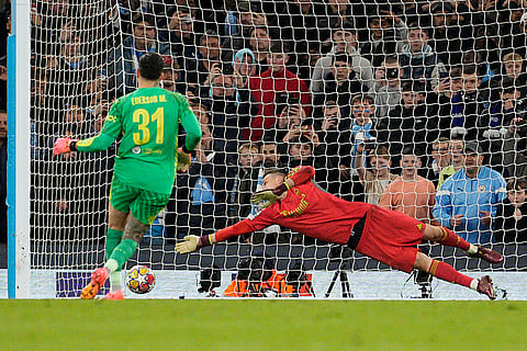 Real Madrid's goalkeeper Andriy Lunin, right, fails to save the ball as Manchester City's goalkeeper Ederson, left, scores a penalty during a penalty shootout during the Champions League quarterfinal second leg soccer match between Manchester City and Real Madrid at the Etihad Stadium in Manchester, England.