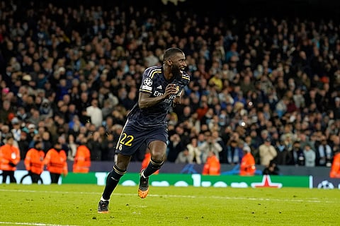 Real Madrid's Antonio Rudiger celebrates at the end of the Champions League quarterfinal second leg soccer match between Manchester City and Real Madrid at the Etihad Stadium in Manchester, England.