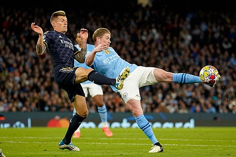 Manchester City's Kevin De Bruyne kicks the ball with Real Madrid's Toni Kroos during the Champions League quarterfinal second leg soccer match between Manchester City and Real Madrid at the Etihad Stadium in Manchester, England.